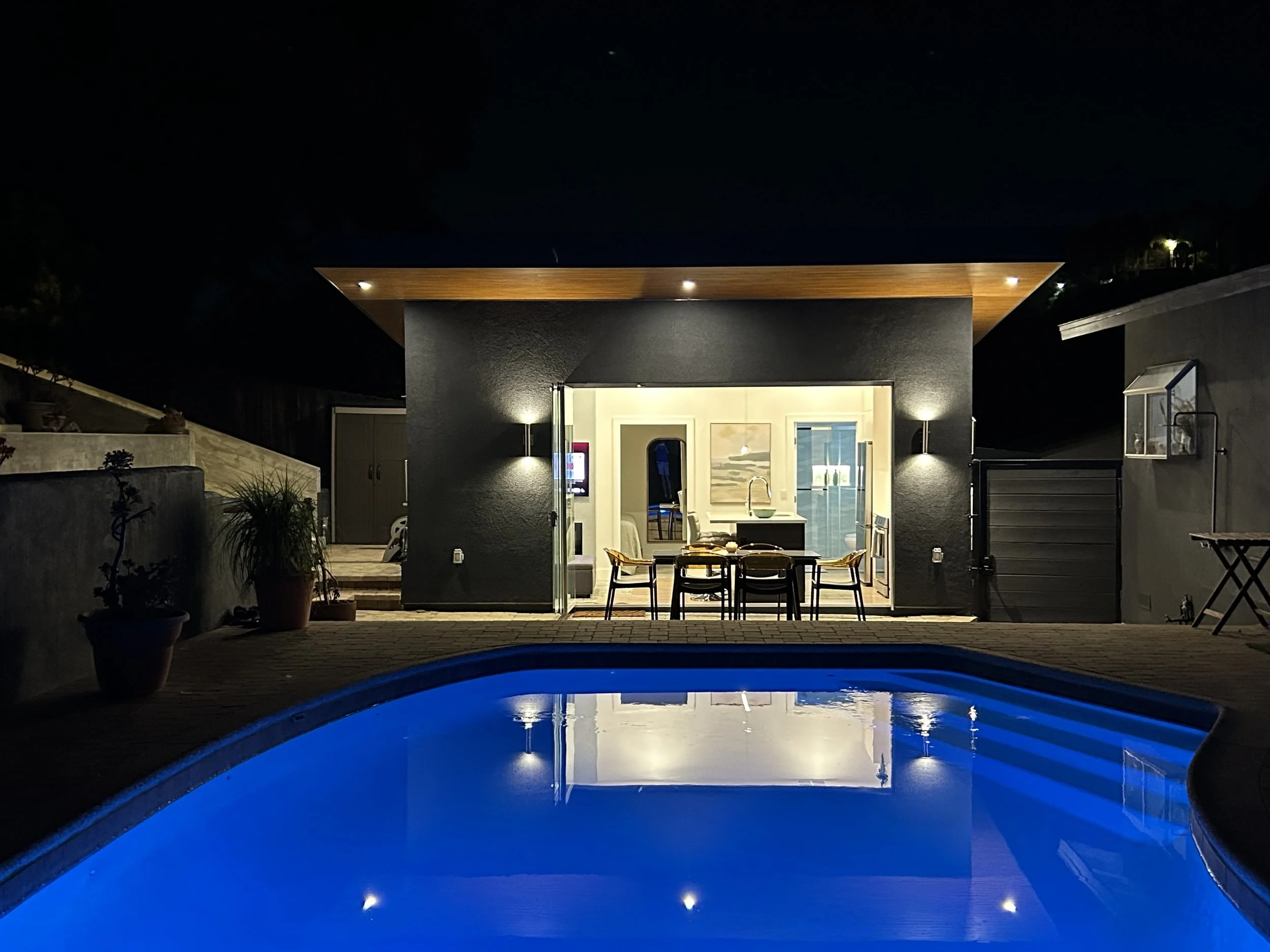 If you are looking for a private, serene, close-to-nature experience with all the amenities of a resort, Casita Excelente is the place for you. Our one-bedroom guest house is tucked behind the main house, next to the swimming pool, surrounded by nature and with a beautiful view of the hills of Woodland Hills. The calming effects of water are at your doorstep with a heated pool and hot tub which sparkle in the daytime and provide a romantic escape in the evenings.